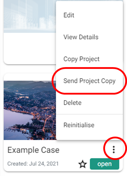 All projects can be easily shared with another user by selecting the options menu on the three dots button and then click on Send Project Copy.