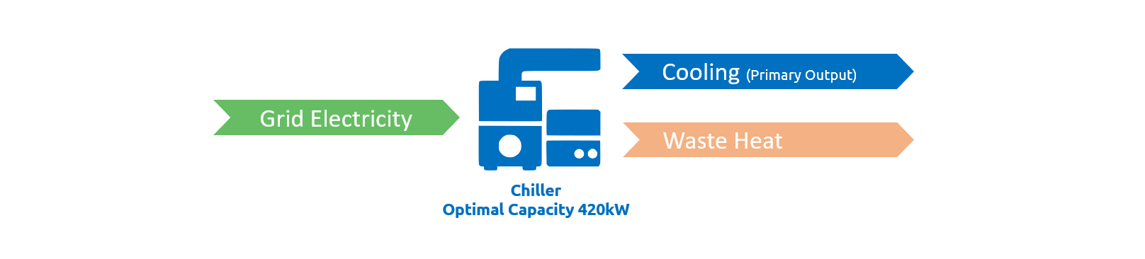 In the example below, the Chiller Candidate is dimensioned to an Optimal Capacity of 420 kW, but the maximal production in the results plot is 800 kWh/h for the combined outputs (Cooling and Waste Heat):