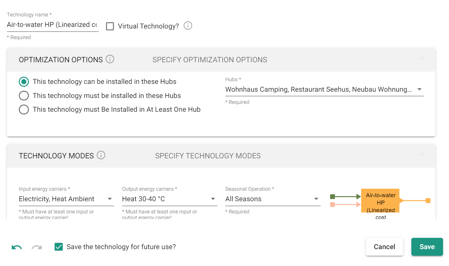 Single items can also be uploaded to My User Database directly from the scenario editor (i.e., Setup), by ticking the box ‘Save the technology for future use?’.