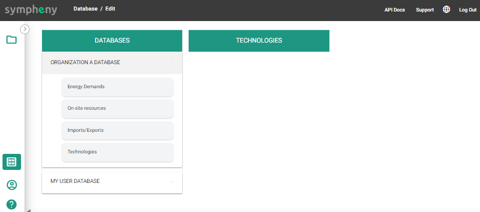 Within the Sympheny Database Center (icon :databaseicon: at the bottom left of your screen), you have access to up to two databases: