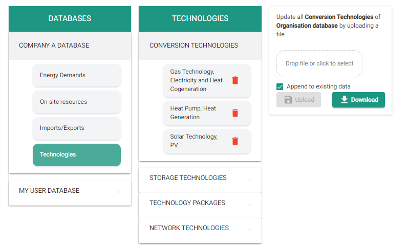 Similarly to the download steps, select the database you wish to replace/add data to as well as the type of data (Energy Demands, On-site Resources or the category of Technology). As prompted, drop or click to select your file and then press upload.