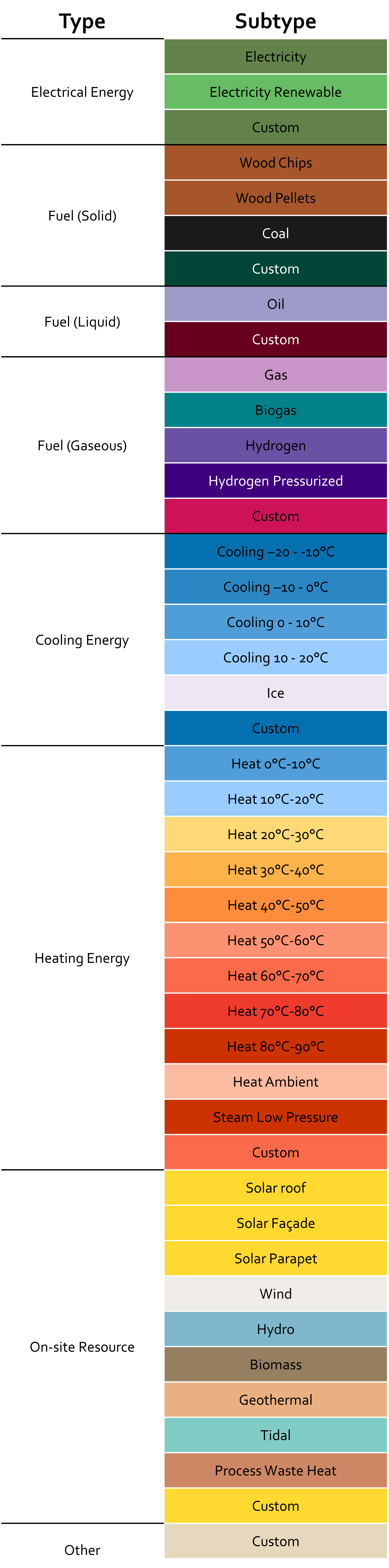 In this step, you specify the energy carriers to be considered in your analysis. For each energy carrier, a Type, Subtype and Name must be defined. For the Type and Subtype, a selection can be made from a list of pre-defined values – see the table below. In case the Type or Subtype you wish to specify cannot be found here, you can choose the Type or Subtype Custom. Note that there is not data directly attached to the type and subtype of your energy carriers. The selection of a Type-Subtype combination will simply define the color used for displaying the lines whenever the specific EC is used.