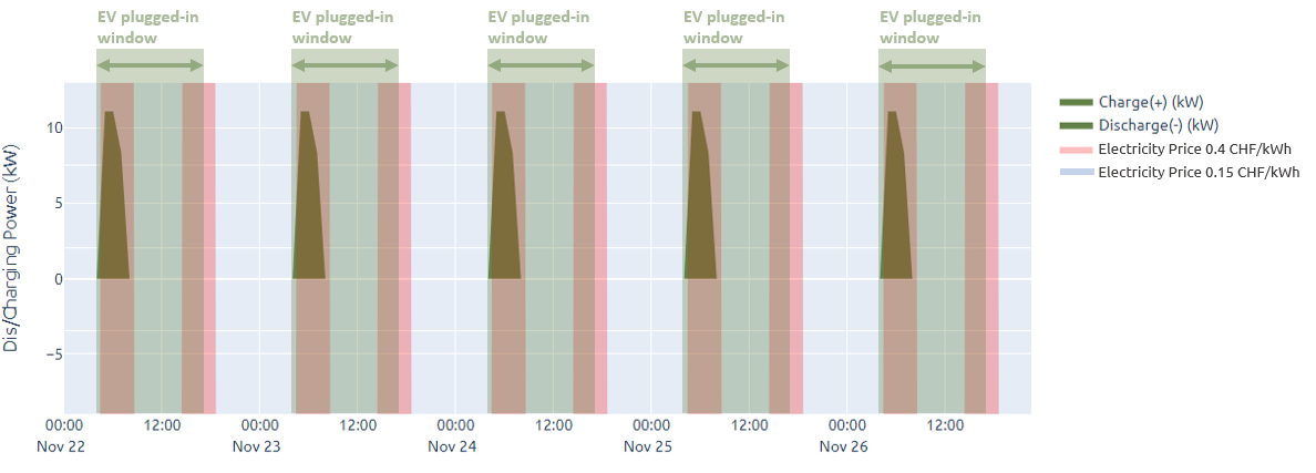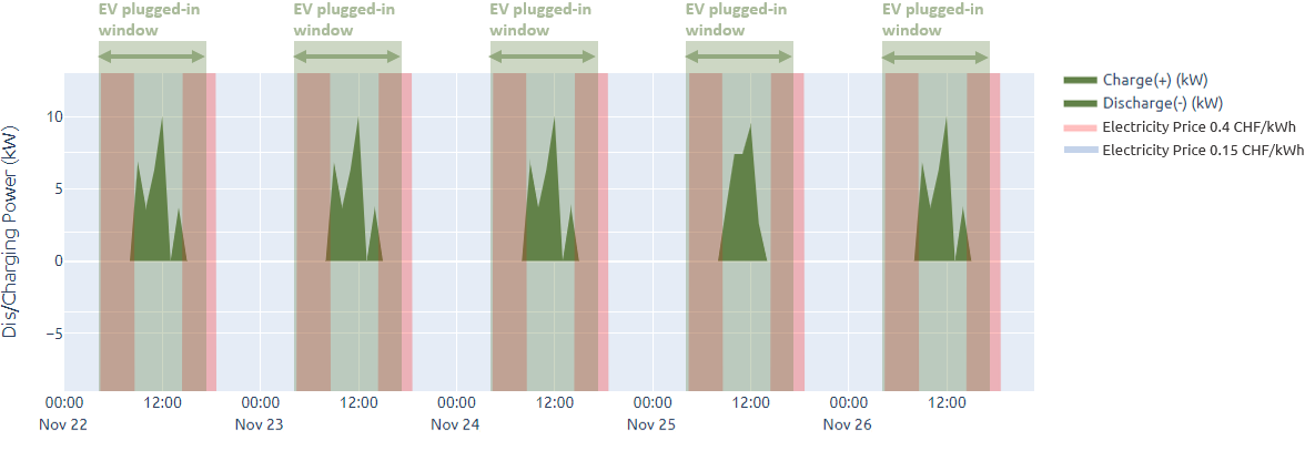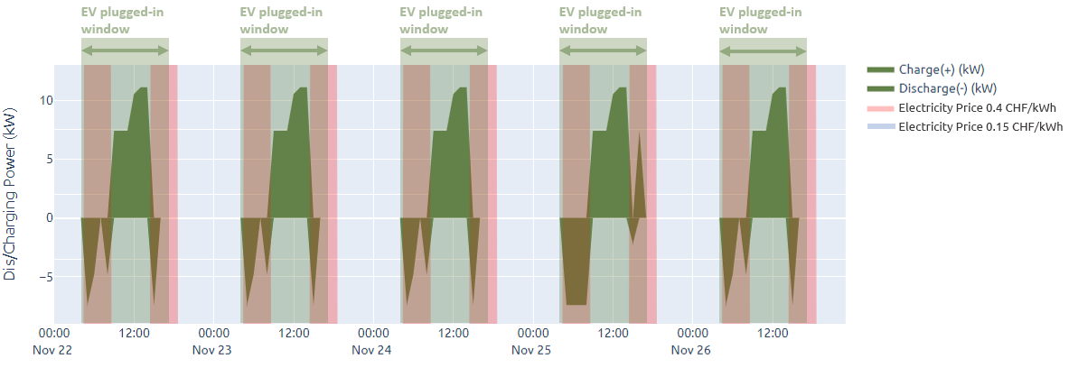 Example of Bidirectional Smart (V2G) dis/charging power (kW) of an EV Battery during a work week. In the case of the optimal cost solution, the vehicle charges when the price of the grid electricity is low (0.15 CHF/kWh) and discharges when the price of grid electricity is high (0.4 CHF/kWh).