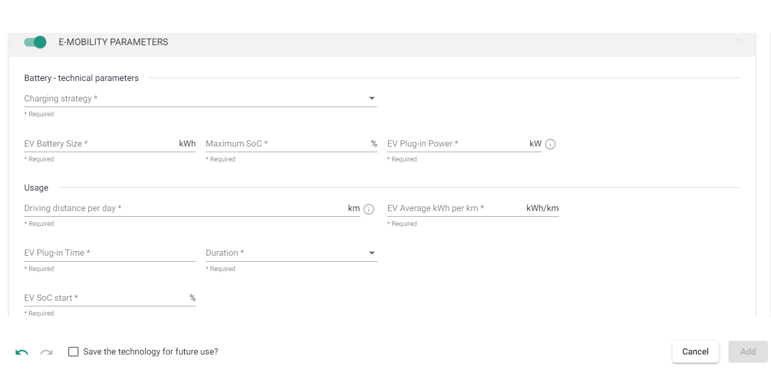On the Supply Technology page, Storage Technology Candidate section, click on Create Custom → toggle on E-mobility Parameters and fill in the necessary entries.