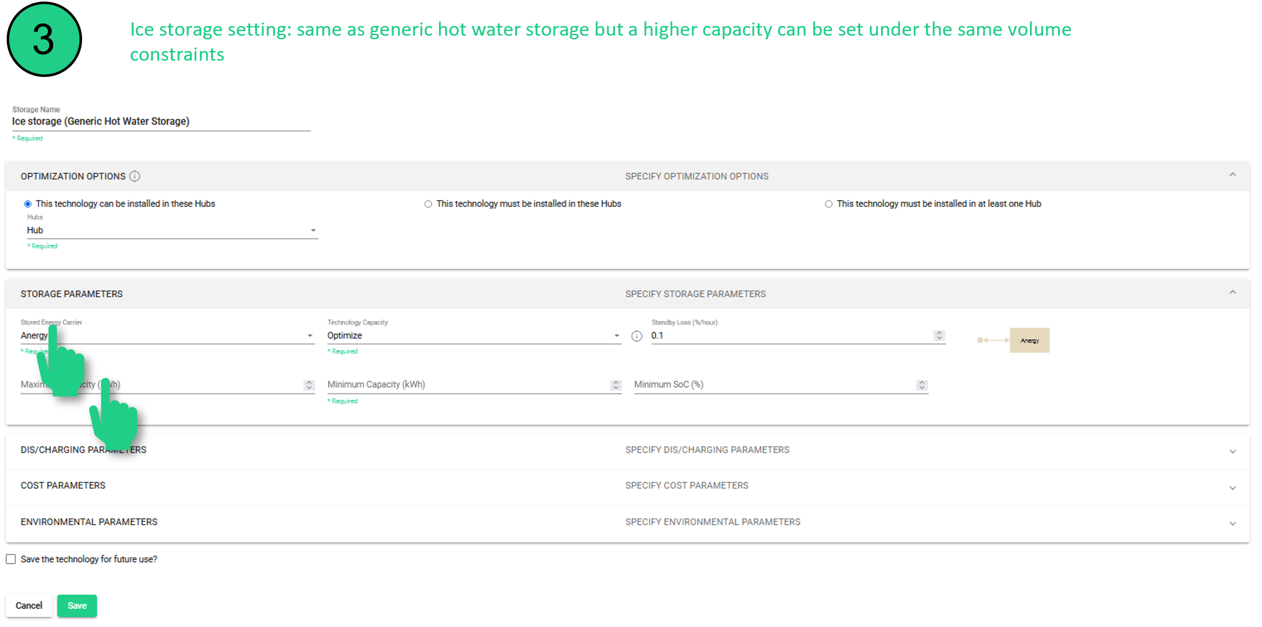 Eisspeicher haben bei gleichem Volumen eine höhere Kapazität als ein normaler Warmwasserspeicher. Dies kann dadurch berücksichtigt werden, dass die maximale Kapazität des Eisspeichers auf einen entsprechend höheren Wert als bei einem Standard-Warmwasserspeicher eingestellt wird.