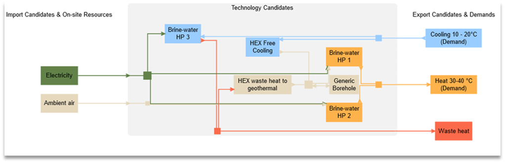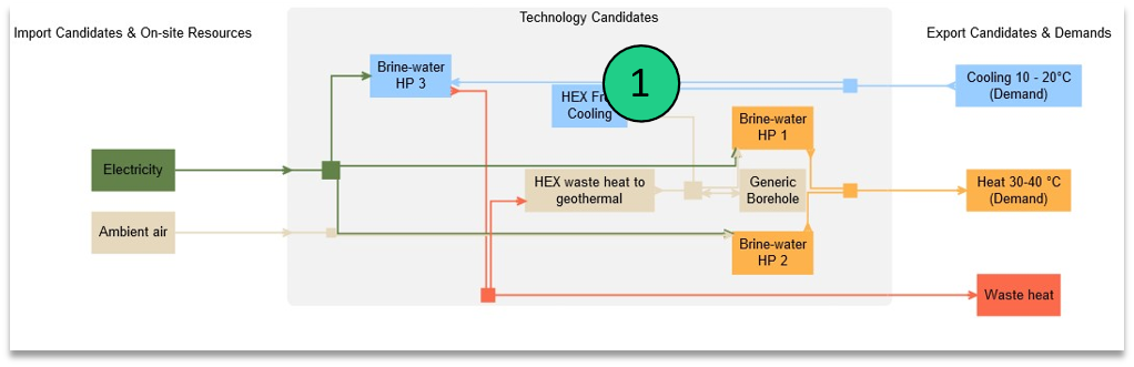 Finally, to allow for the system to cover the cooling demand with the active cooling, a virtual technology is added, transforming active cooling into cooling 10-20°C (the energy carrier of the demand).