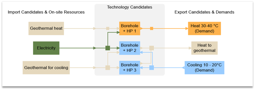 In this case the modelling is similar to the Groundwater Heat Pump modelling. In this case, the regeneration potential must be calculated manually, by comparing the quantity of ‘Geothermal heat’ imported and the ‘Heat to geothermal’ exported.