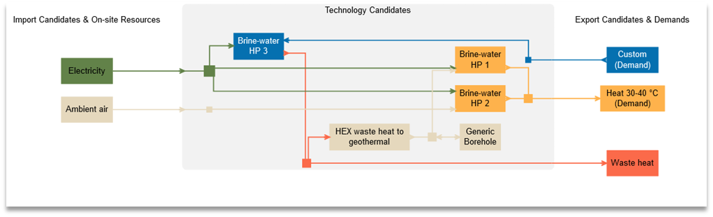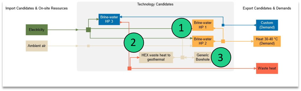 Furthermore, it is not assured that the amount of waste heat (from HP3) is the same as the annual discharge of the borehole. In case when the excess waste heat needs to exit the system, it should be possible to export this energy carrier.
