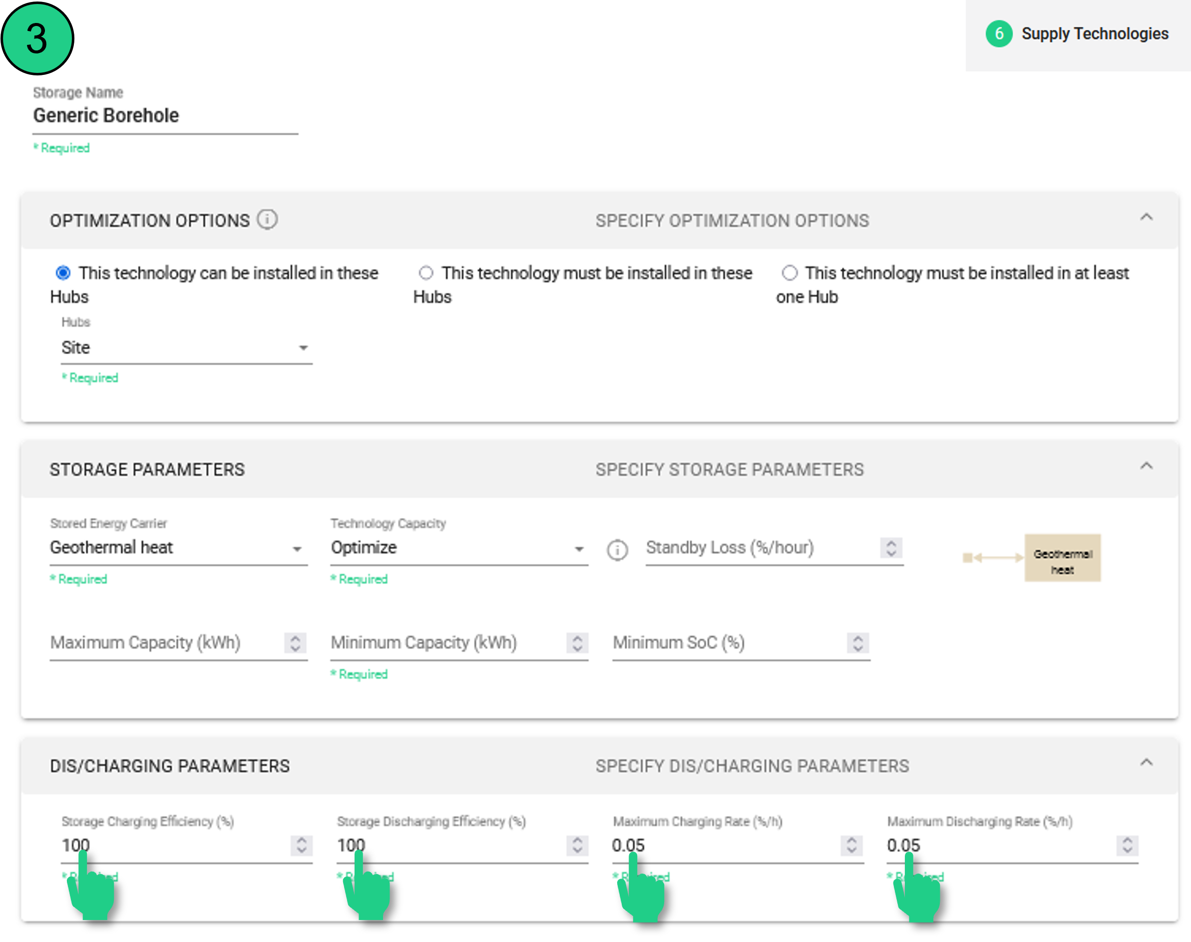 Die Lade- und Entladewirkungsgrade müssen auf 100 % eingestellt werden. Da die Speichertechnologie die Möglichkeit hat, gleichzeitig zu laden und zu entladen, kann dies zu Verlusten führen. Wenn das Bohrloch voll geladen ist, kann dieses Prinzip genutzt werden, um das System zu "entladen" (indem große Energiemengen geladen und entladen werden).