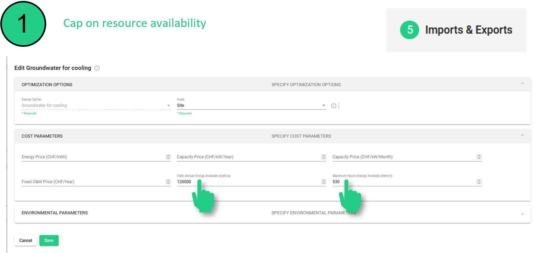 Auf der Registerkarte "Importe & Exporte" kann die maximal zulässige Menge des Energieträgers "Grundwasser" begrenzt werden, um ökologische/gesetzliche Beschränkungen oder die technische Kapazität der Grundwasserpumpe zu berücksichtigen.