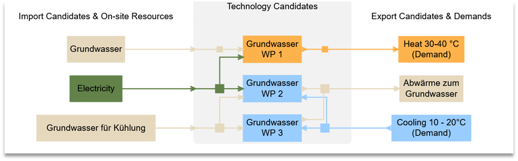 Im Rahmen der Modellierung der Umwandlungstechnologie wird dieser Energieträger den Energieträger Abwärme an das Grundwasser widerspiegeln. Damit wird automatisch auch der Energieträger "Abwärme an das Grundwasser" begrenzt.