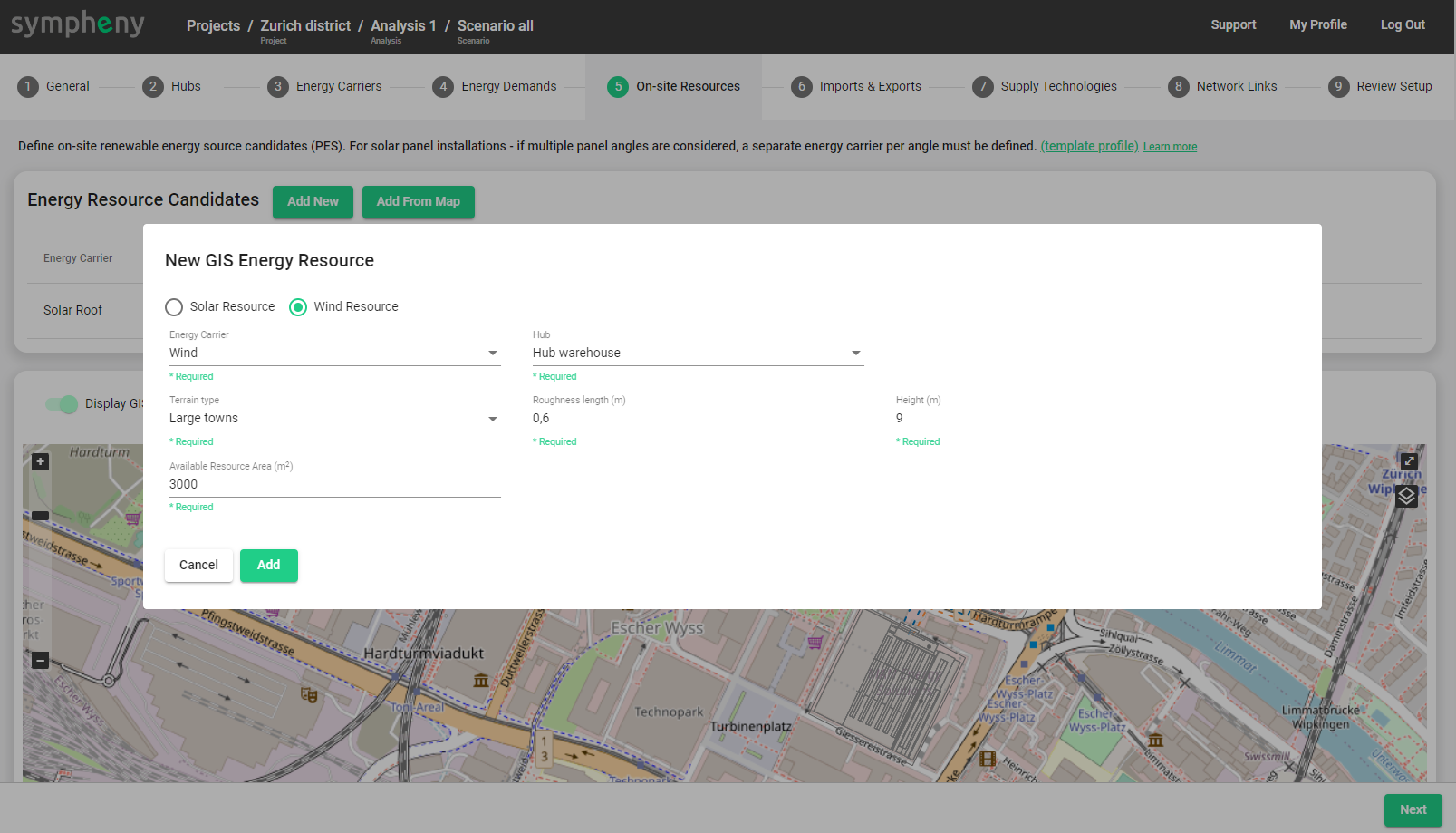 By default, the Available Resource Area (m2) for the Wind Resource is the area drawn for the selected Hub in the map.