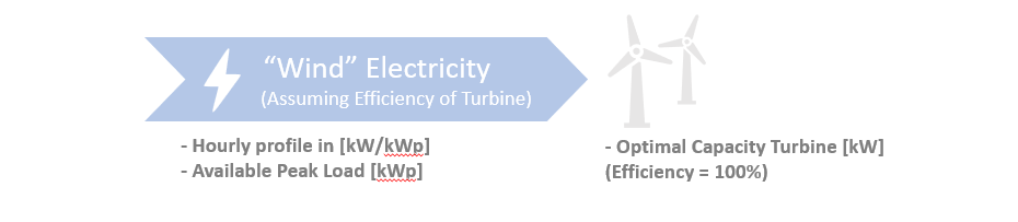 For example, when considering Wind, an intermittent energy resource, the Hourly Resource Profile indicates the availability of Wind Electricity in kW per unit of peak load [kW/kWp]. In this case, a conversion efficiency is already considered in the hourly resource profile, the conversion efficiency of the Wind Turbine Technology should be forced to 100%.