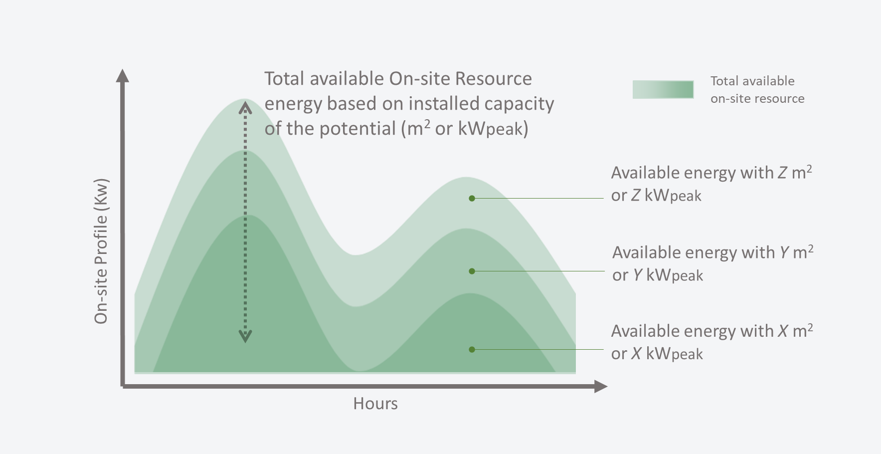 Total available on-site resource depending on optimal sizing in m2 or kWp.