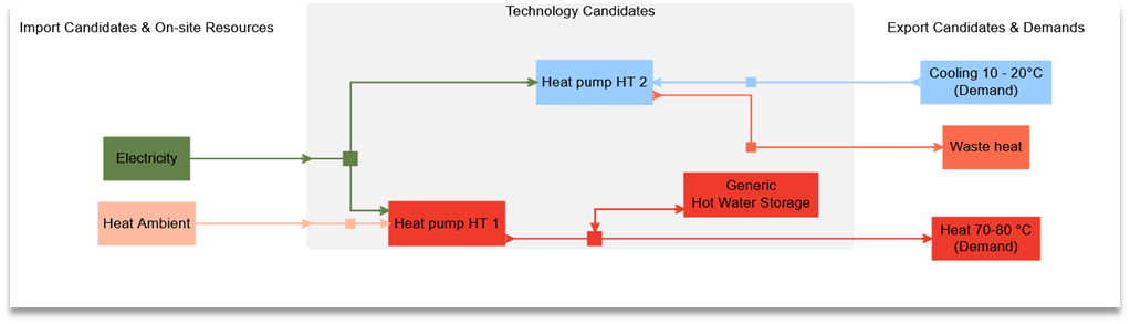 Let’s add a cooling demand to the standard heat pump system. In this case, the heat pump could be reversible, to be used as well for cooling. The modelling of a reversible heat pump follows the exact same principles as when modelling a heat pump with two modes for different temperature levels (see section 2.2.3 Heat pump with two modes).
