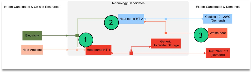 Within Sympheny, modes can operate simultaneously during the same hour. If a capacity limit is set, this is valid for the sum of both modes over the hour. For a realistic operation, it is therefore strongly advised to integrate a heat storage (at least for one of the temperature levels). Notes: Modes of a technology can be spotted by their names: each mode has its mode number appended to the name of the technology (e.g. ‘Heat pump HT 1’ and ‘Heat pump HT 2’) are the operation modes of one single technology.