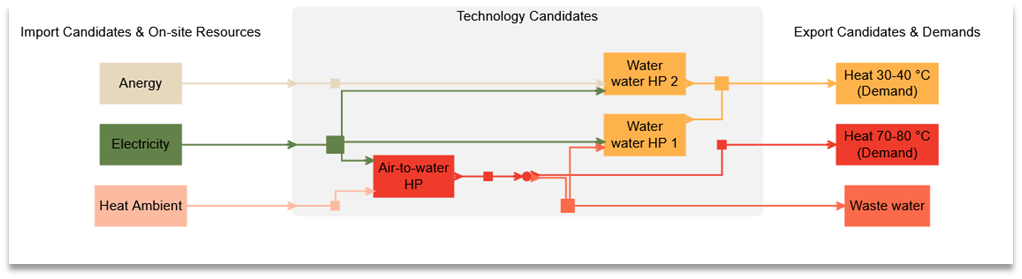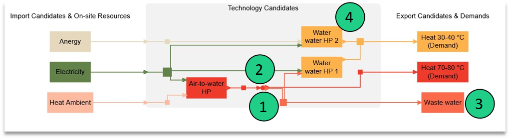 In a similar reflexion, there need to be a technology allowing to create heating, which is not based on wastewater (for cases where no wastewater is available). In this case, the heat pump is considered to have a second mode, working on an alternative anergy source.
